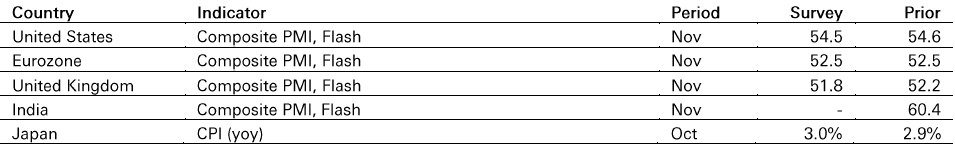 In the UK, composite PMI is likely to drop to 51.8 in November, from 52.2, as rising tax worries are likely to weigh on business confidence.