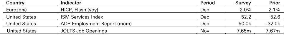 In the US, the ISM services index is expected to have edged lower to 52.2 in December, from 52.6 in November, but stayed in expansionary territory. JOLTS job openings have increased recently, but the quits rate has fallen, pointing to subdued wage growth, and layoffs have edged up. Meanwhile, the ADP employment measure is expected to rise 50k in December, following November’s 32k fall.