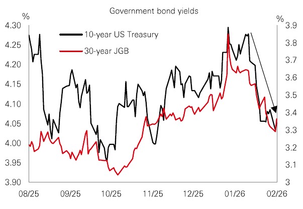 US Treasuries rallied in February (yields fell). But that’s a puzzle against a backdrop of hot growth, two-way inflation risk, and rising oil prices. What’s the story here? A big part of the answer lies in Japan. Long-dated Japanese bond (JGB) yields reached multi-decade highs in mid-January but have since repriced sharply on easing fiscal and inflation concerns. The key point is that in bond markets, the long end is global, while the short end is local. For Treasuries, the US Fed anchors the short end of the curve, but the long end is influenced by international factors, global capital flows, and relative yield dynamics. And, recently, JGBs have been in the driving seat and the key focus for global investors (see chart). |