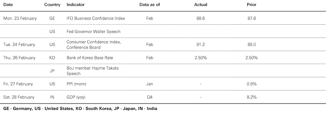 Global equities shrugged off resurging US tariff uncertainties, with emerging markets outpacing developed markets. In Europe, the FTSE 100 and Euro Stoxx 50 both reached new highs. In the US, technology stocks experienced choppy trading, as investors distinguished between the “disruptors” and the “disrupted”. The rotation into “asset-heavy” sectors, including energy and utilities, persists, while value stocks extended gains relative to growth stocks. Across Asia, the Nikkei 225 hit a new high. The Kospi index also surged to fresh highs, boosted by strength in technology stocks. The Shanghai Composite advanced ahead of the annual National People’s Congress, while Sensex declined. The US dollar weakened modestly against most major currencies, alongside lower US Treasury yields, with major bond indices edging higher over the week.