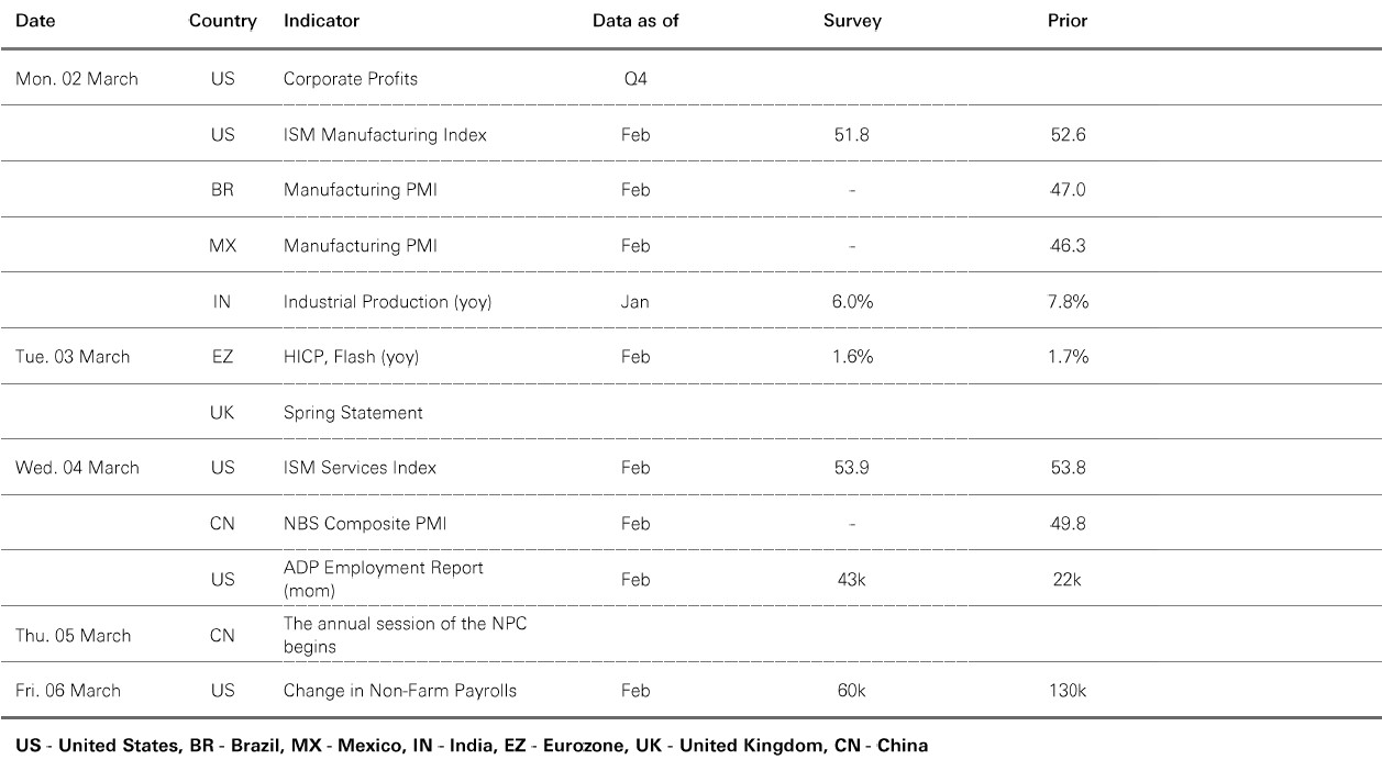 Past performance does not predict future returns. The level of yield is not guaranteed and may rise or fall in the future. For informational purposes only and should not be construed as a recommendation to invest in the specific country, product, strategy, sector, or security. Diversification does not ensure a profit or protect against loss. Any views expressed were held at the time of preparation and are subject to change without notice. Index returns assume reinvestment of all distributions and do not reflect fees or expenses. You cannot invest directly in an index. Any forecast, projection or target where provided is indicative only and is not guaranteed in any way. Costs may vary with fluctuations in the exchange rate. Source: HSBC Asset Management. Macrobond, Bloomberg. Data as at 7.30am UK time 28 February 2026.