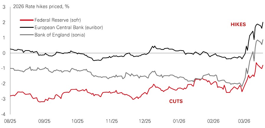 But is 2022 the right playbook for today? For inflation to remain persistent, an initial shock must be transmitted through the broader macro system. Today, this might be less of a threat than a few years ago. Western GDP growth rates are notably weaker than they were back then, US growth is unbalanced, labour markets are fragile, and monetary policy is neutral-to-mildly restrictive. Furthermore, amid strained public finances, there will likely be only a tepid fiscal response to support households through this crisis. We are operating in an environment where the so-called “second-round” effects of the initial shock – driven by higher wage demand and increased corporate pricing – are likely to be limited.