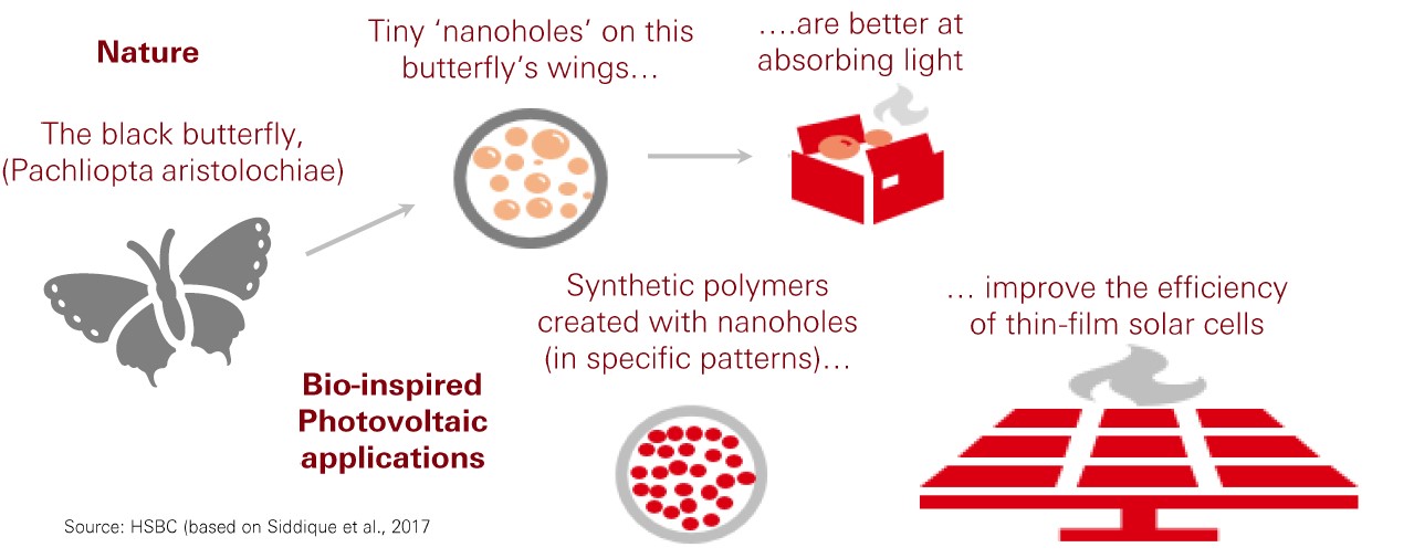 Researchers studied the light-absorbing black wings of a certain butterfly, finding tiny, random holes that scatter sunlight for better absorption. By mimicking this design, researchers created thin silicon solar cells with similar holes which can absorb light regardless of the angle.[@why-esg-matter-01-3]