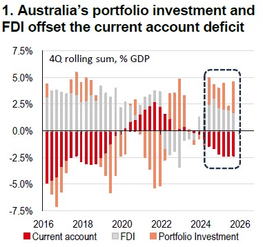 Looking ahead, expectations of further rate increases, and Australia’s favourable structural fundamentals are likely to underpin continued AUD strength, even if external tailwinds subside. Notably, net inflows from portfolio investment and foreign direct investment (FDI) are more than sufficient to offset the current account deficit (Chart 1). Furthermore, Australia’s debt profile provides resilience against fiscal vulnerabilities, despite rising public sector demand. Collectively, these factors suggest the AUD is well positioned for ongoing outperformance.