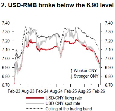 The RMB has strengthened by more than 1% against the USD year-to-date, with USD-RMB breaking below 6.90 for the first time in 33 months (Chart 2). China’s domestic agenda, particularly RMB internationalisation, and favourable seasonal flows are expected to continue supporting the currency throughout 2026.