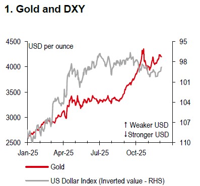 Gold prices have recently returned to around USD4,200 per ounce, underpinned by increased risk aversion and growing expectations of a 25bp rate cut by the Federal Reserve (Fed) at its 9-10 December meeting.