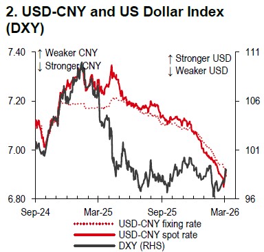 China’s latest government work report has outlined its FX policy priorities for 2026, reaffirming the longstanding objective of maintaining the RMB exchange rate at stable and reasonable levels. Notably, this year’s report places greater emphasis on expanding the use of RMB in cross-border transactions, which is in line with President Xi Jinping’s call for the RMB to become a global reserve currency (FT, 1 February). These priorities, alongside boosting domestic demand, pursuing more balanced trade growth, and upgrading technology, align with the People’s Bank of China’s policy towards gradual diversification away from the USD, reflected in lower USD-CNY fixing rates despite the broader USD rebound (Chart 2).
