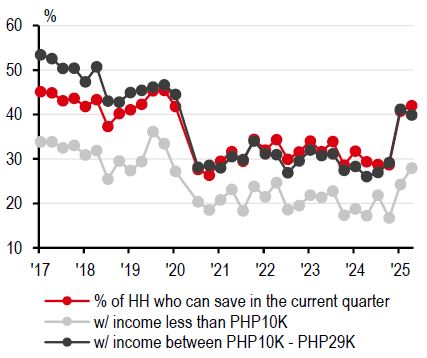 With inflation finally under control, the purchasing power of households has remained intact. As a result, private consumption, the economy’s main engine, has accelerated for two consecutive quarters already. And, despite consuming more, households, especially low and middle-income ones, were finally able to save. In fact, BSP data shows that the share of households with income of less than USD500 a month that were able to put aside money for savings was almost back to prepandemic levels in 2Q25. This has pushed the national saving rate high enough to close the economy’s saving-investment gap during the quarter, making the economy less reliant on foreign capital to finance its current account deficit.