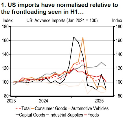 The EU is likely to be strongly affected by the pharma tariffs, even if they end up being capped at 15% as anticipated by the European Commission - imports from Ireland have already been frontloaded earlier this year. Switzerland and Singapore will also be substantially impacted. Meanwhile, Vietnam is the top import source for furniture and household fittings, and so could see some impact if trade flows dip.