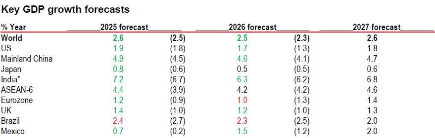 We recently revised up our global GDP growth forecasts a touch, reflecting stronger than expected growth in many countries in Q2 rather than an improving outlook. The biggest upgrades are to India, parts of ASEAN and Mexico. Still, we see global GDP growth slowing from 2.8% in 2024 to 2.6% in 2025 and 2.5% in 2026.