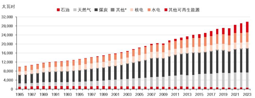 资料来源:能源研究所 2024 年《世界能源统计年鉴》;其他*:基于总产出,包括未分类的发电、统计差异和其他方面未指定的来源,如抽水蓄能、不可再生废弃物和来自化学来源的热能 。