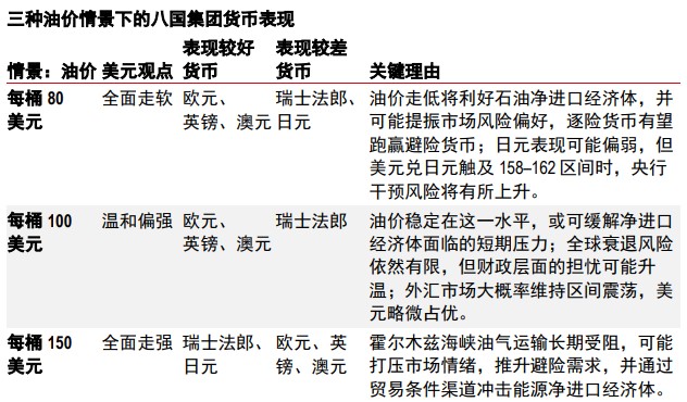 中东地缘政治仍是外汇市场的主要驱动因素。然而,相关消息面较难解读,原因在于地区紧张局势可能会迅速升级或缓和。我们认为,市场走向可能取决于几项实际指标,尤其是霍尔木兹海峡航运受阻的程度,以及由此引发的油价走势。随着地缘政治风险跌宕起伏,油价可能出现剧烈波动,推动市场情绪在“避险”与“逐险”之间反复切换。下表汇总了三种油价情景下八国集团货币的潜在表现。