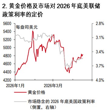 今年以来,黄金价格波动剧烈。1月30日一度攀升至每盎司约5,450美元的历史高位,随后在3月23日跌至每盎司约4,405美元的年内低点,之后回升至每盎司4,800美元左右。本轮金价回调主要是美元走强(图1)、美债收益率上行、油价高企、股市走弱以及中东持续冲突引发的集中清算抛售所致。冲突升级后,市场已将美联储2026年底前的降息预期至少下调25个基点(图2),这也对黄金不利。