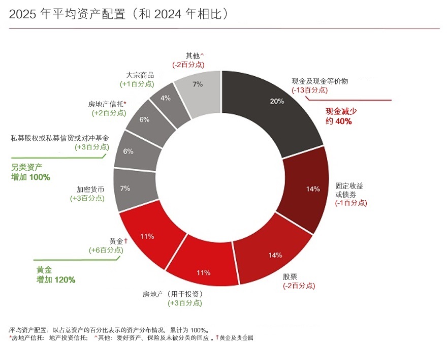当道路崎岖不平时,您会信赖可靠的避震系统,继续前进。在目前波动的市场中,投资者并未转向现金避险,而是保持股票和优质债券作为核心引擎,同时增添额外的“避震”保护:政府债券抵御市场调整的冲击,黄金降低通胀的压力,基建和房地产提供稳定的现金流缓冲,而灵活的对冲基金策略则用于应对突如其来的变动。下图显示了投资组合配置和去年调查相比的变化。“避震” 保护让投资组合仍能加速增长,免受震荡所带来的影响。