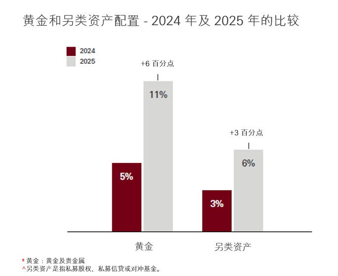 谈及分散多元化资产,投资者通常联想到政府债券和黄金,但其实选项远不止于此;今年的《富裕投资者调查简报》中,数据显示富裕投资者在过去一年中对黄金及贵金属的配置增加了一倍,对另类资产的兴趣也有所增加。