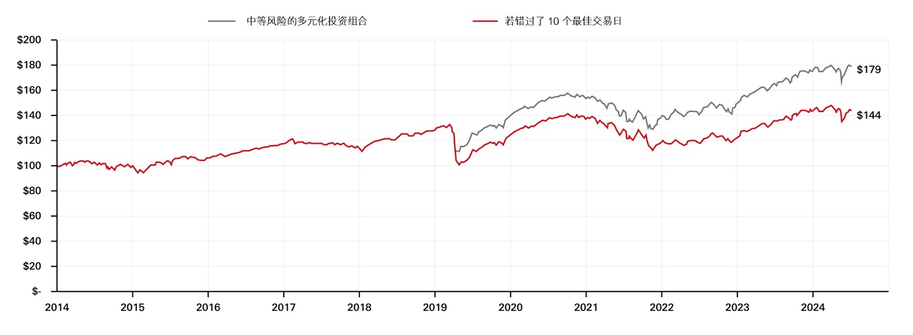 近几个月的情况印证了这一点。政策转向导致市况大起大落,大跌之后紧随强劲反弹,错过这些反弹的代价高昂。下图说明了在过去10年间,一个高度多元化的投资组合累计回报达79%;但若错过了当中10个最佳的交易日,回报便锐减至44%。