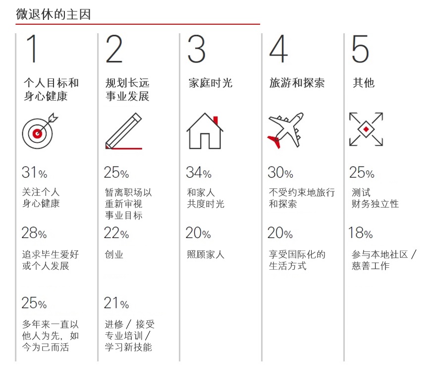 受访者有意选择微退休的主要推动因素包括:追求个人理想和身心健康、暂时放下工作以重新审视事业目标、和家人共度时光、旅游和探索,以及投身慈善工作等。