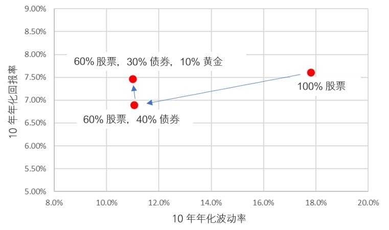 以一个完全由美股组成的投资组合为例,若加入40% 的债券,在过去十年内可大幅降低波动性,而对回报的影响相对有限。如果再加入10% 的黄金,可在风险几乎不变的情况下提升整体回报。若再加入其他资产类别,例如新兴市场股票或对冲基金,则可进一步优化整体的风险和回报表现。