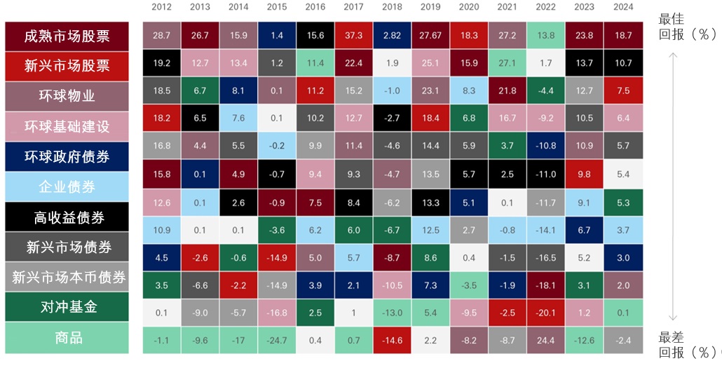 观察近年市场表现,便可理解这一点:下表列出了各类资产每年的回报表现及排名。股票一般被视为风险较高的资产,某些年份表现出色,但也时有低谷;优质债券虽较少出现大幅亏损,但在股市或高风险资产飙升时,表现往往相对逊色。由此可见,没有任何单一资产能始终跑赢,也难以预测哪类资产在某一年表现最佳。因此,这也是分散投资的另一个重要原因,因为多元化配置不仅有助改善投资组合的风险回报结构,同时有利于把握更广泛的投资机会。