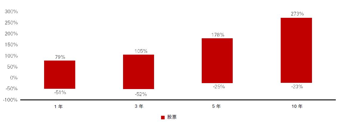 例如,左轴显示1999年至2025年间,环球股票在任何一年期内的表现介于 -51% 至79% 之间;而任何十年期内的表现则介于 -23% 至273% 之间。