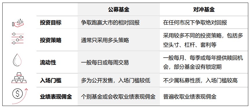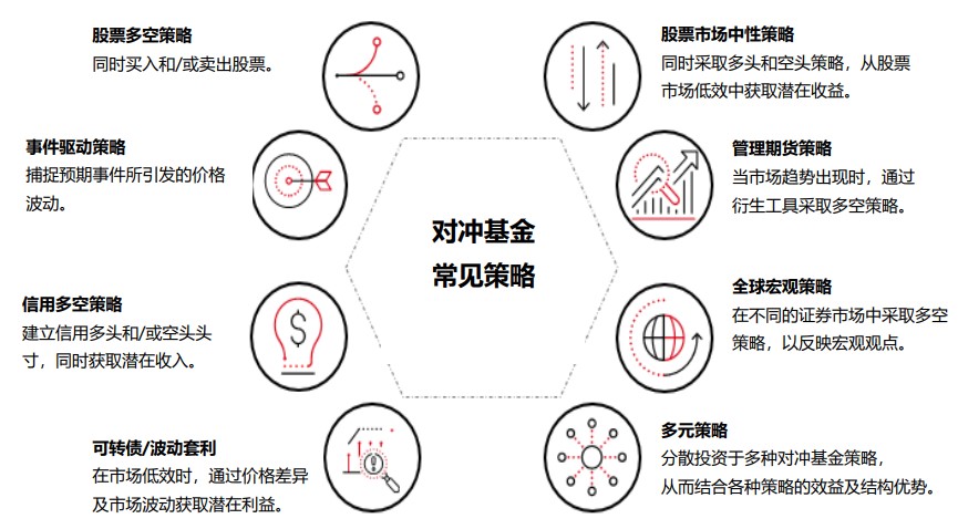 对冲基金采用非传统的投资策略,包括多空头寸(结合买入及卖出策略)、杠杆 (利用借入资金进行投资)、套利(利用不同资产市场的价格差异)、互换(交换金融工具或现金流,例如固定利率和浮动利率) 等 ,以管理风险并提高潜在回报。这些策略与传统资产的相关性较低,其多元化的优势可减低投资组合的波幅,相对传统资产或有助抗衡市场低迷时期的冲击,并提供较佳的潜在回报。