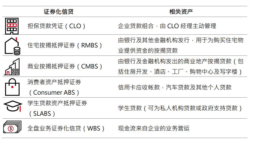 证券化信贷是一种资产类别,它包含债券或可产生现金流的资产所组成的工具,包括住宅及商业楼宇按揭贷款、汽车贷款、信用卡贷款等。这些欠缺流动性但可产生现金流的资产会被买入,然后透过证券化程序重新组合成不同级别的产品。