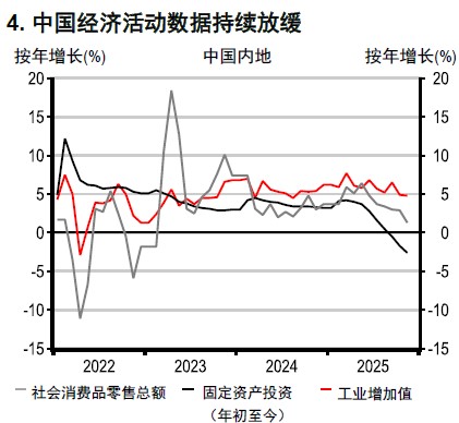 我们目前预测2025 年全球国内生产总值增长2.8%,高于年初的2.7%。我们最近还将2026 年增长预测从2.5%上调至2.7%,这主要得益于对美国经济增长预测的上调,反映政府重新运作后的补偿性增长。尽管如此,我们注意到美国政府可能在1 月底再次停摆,这可能造成经济数据波动。我们亦大幅上调日本经济增长预测,反映出近期批准的财政刺激措施。