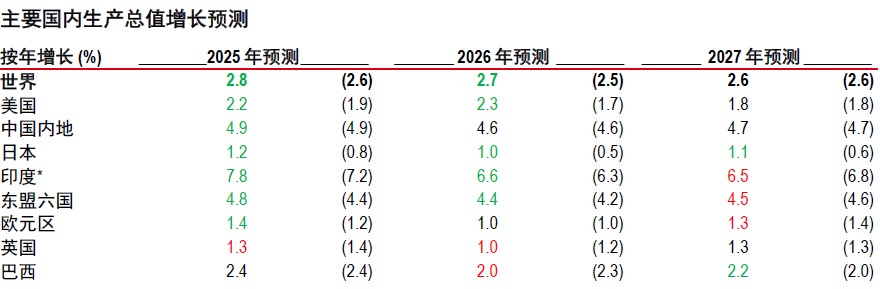 注:*为便于比较,印度数据为日历年度预测。此前预测在括号中显示,来自2025 年10 月6 日的宏观月刊。