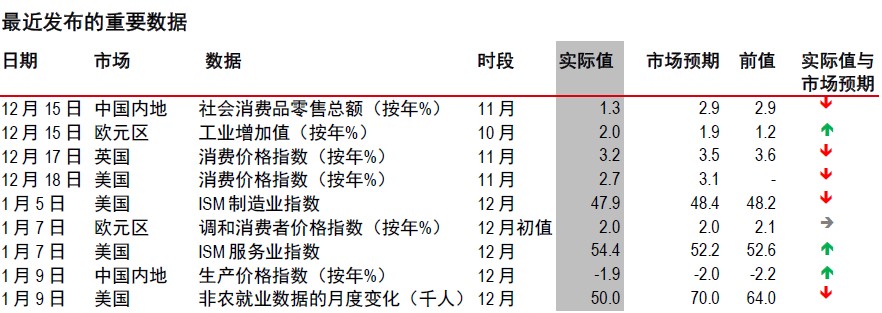 ⬆ 高于预期——实际值高于市场预期,⬇ 低于预期——实际值低于市场预期,➡ 实际值符合市场预期